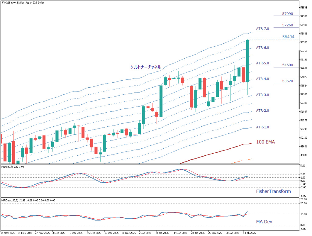 价格在维持凯特纳通道ATR-3.0支撑的同时保持上升趋势,近期以一根长阳线实现进一步走高,目前已触及约56,494日元水平,接下来能否继续向上突破成为关注焦点。