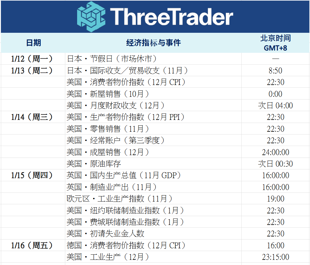 1 月 12 日至 16 日期间,美国 CPI、零售销售、PPI 等物价与消费核心指标密集发布,连同就业数据在内,“通胀—就业—消费”的联动关系将再次被市场检视。受委内瑞拉局势影响,若原油供应增加预期升温,WTI 原油上行空间或受压,并可能波及与资源价格相关性较高的加元。黄金与白银此前走强,部分源于地缘政治风险下的短期避险需求,但目前已处高位区间,需留意回调风险。
