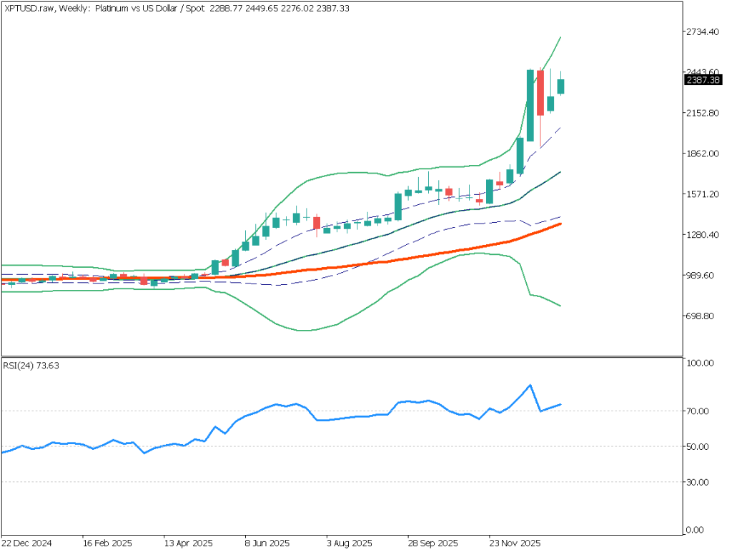 对铂金的周线图进行分析。价格形成了布林带 +1σ 至 +3σ 区间的带状运行(Band Walk),周线层级的波动率显著放大。