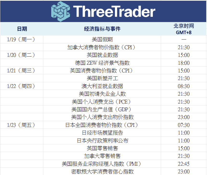 周初 1/19 美国为假期,市场整体较为平静,但将公布加拿大CPI与政策利率,需警惕加元波动。