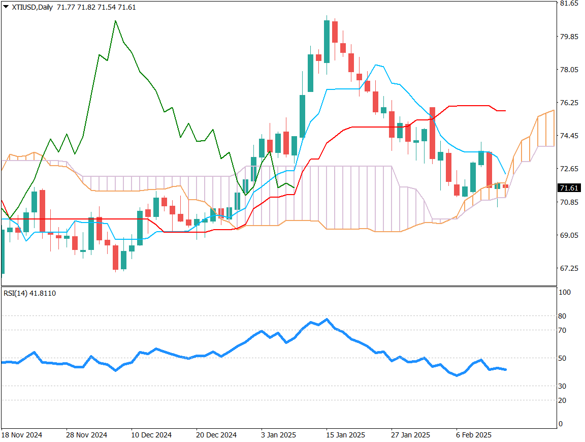 原油明显处于下跌趋势,目前跌至 71.6 美元。该转换线充当阻力位,突破 70 美元指日可待。关键在于周末乌克兰停火谈判能取得多大进展。如果停火发生,对俄罗斯的监管将会放松,这可能会导致能源价格下跌。 我们预计价格将逐渐跌向 67 美元的强劲支撑位。