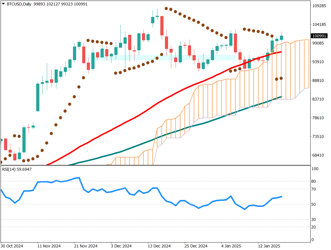分析比特币的日线图。比特币沿着云带上升,并且维持在10万美元以上。之前处于区间震荡走势,但可能由于市场对特朗普政府即将放松对加密资产的监管有所期待。