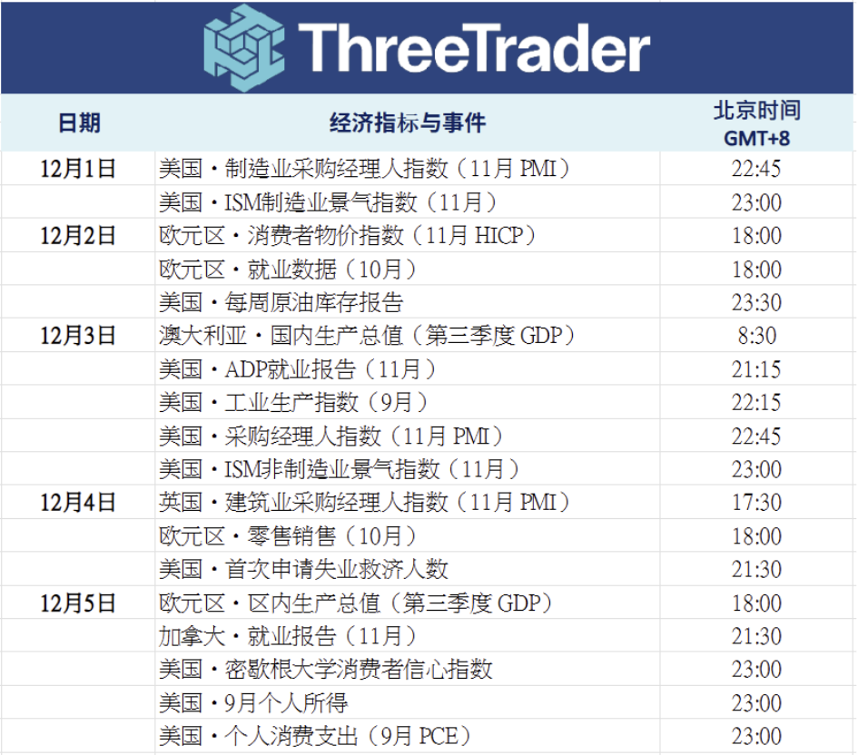 随着下周进入 12 月行情,将迎来美国 ISM 制造业指数、ADP 就业数据及 PCE 等一系列重要指标。特别是核心 PCE 的放缓速度,将极大影响 12 月 FOMC 的降息判断,并左右美元与利率走势。感恩节假期结束、市场参与者回归后,整体波动可能进一步放大。