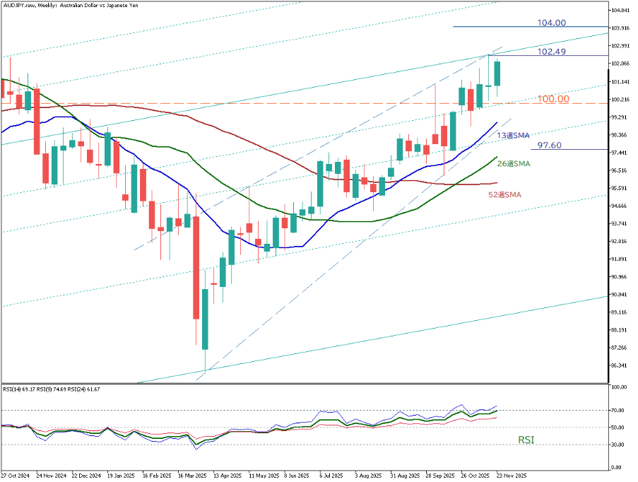 从澳元兑日元的周线图来看,汇价已明确突破关键心理关口 100.00 日元,整体维持稳定的上升趋势。