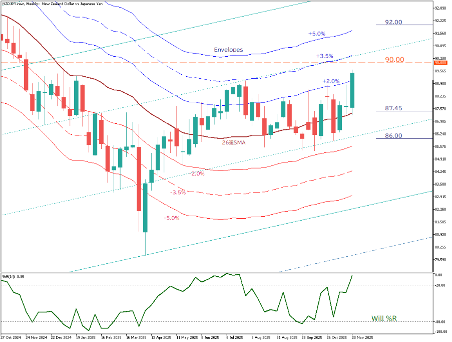 从 NZD/JPY 周线图来看,近期 K 线已明确上破 26 周 SMA,并伴随移动均线乖离扩大,呈现出明显的强势结构。