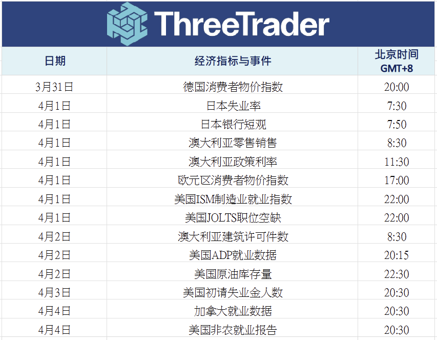 下周将公布多项重要经济指标,市场焦点集中在3月31日的德国消费者物价指数、4月1日的日本央行短观与美国ISM制造业指数,以及4月4日的美国非农就业报告。