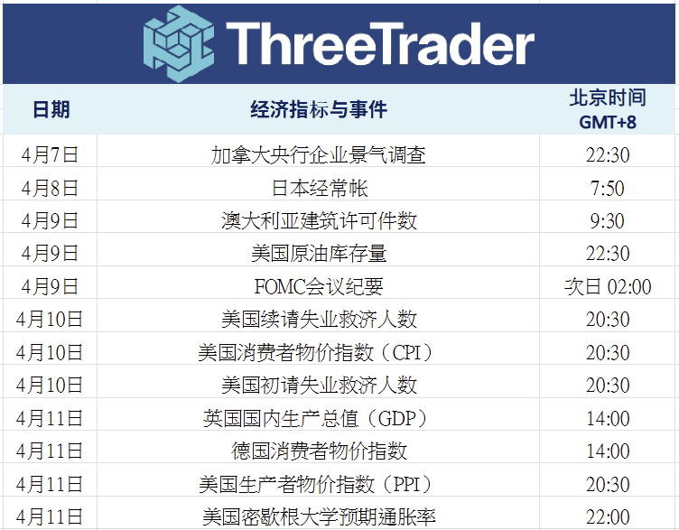 4月7日至11日的重点经济指标包括4月9日的FOMC会议纪要与4月10日的美国消费者物价指数(CPI)。